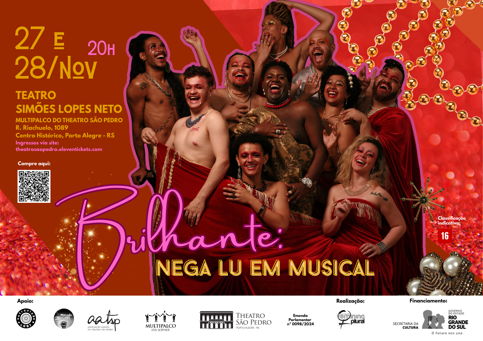 Com direção geral de Daniel Colin e direção musical de Juliano Barreto, "BRILHANTE" celebra as múltiplas dimensões de Nega Lu - bailarina, cantora, figura queer negra e ícone da vida noturna de Porto Alegre. O espetáculo enaltece sua trajetória ao propor um diálogo entre o período que viveu, passando pela Ditadura Militar e a epidemia de AIDS, e a realidade atual da comunidade negra e LGBTQIAPN+. Através de trilhas sonoras que conectam diferentes temporalidades, o musical promove o protagonismo de corpos historicamente silenciados. "BRILHANTE" mostra uma Nega Lu não presa na história, mas transitando por um tempo espiralar. O musical exalta sua presença em espaços de cultura e resistência, como a histórica boate Flower's e o Bar Alaska na Esquina Maldita, evocando sua pluralidade: desde carnavalesca e solista no Coral da UFRGS e OSPA a vocalista de blues e rock na banda "Rabo de Galo". Com performances que transitam entre a cultura Ballroom e o Carnaval, a espetáculo também presta reverência às suas raízes ancestrais como Filha de Xangô. "BRILHANTE: Nega Lu em Musical" é uma celebração que revisita e festeja a vida e memória da apoteótica Nega Lu.